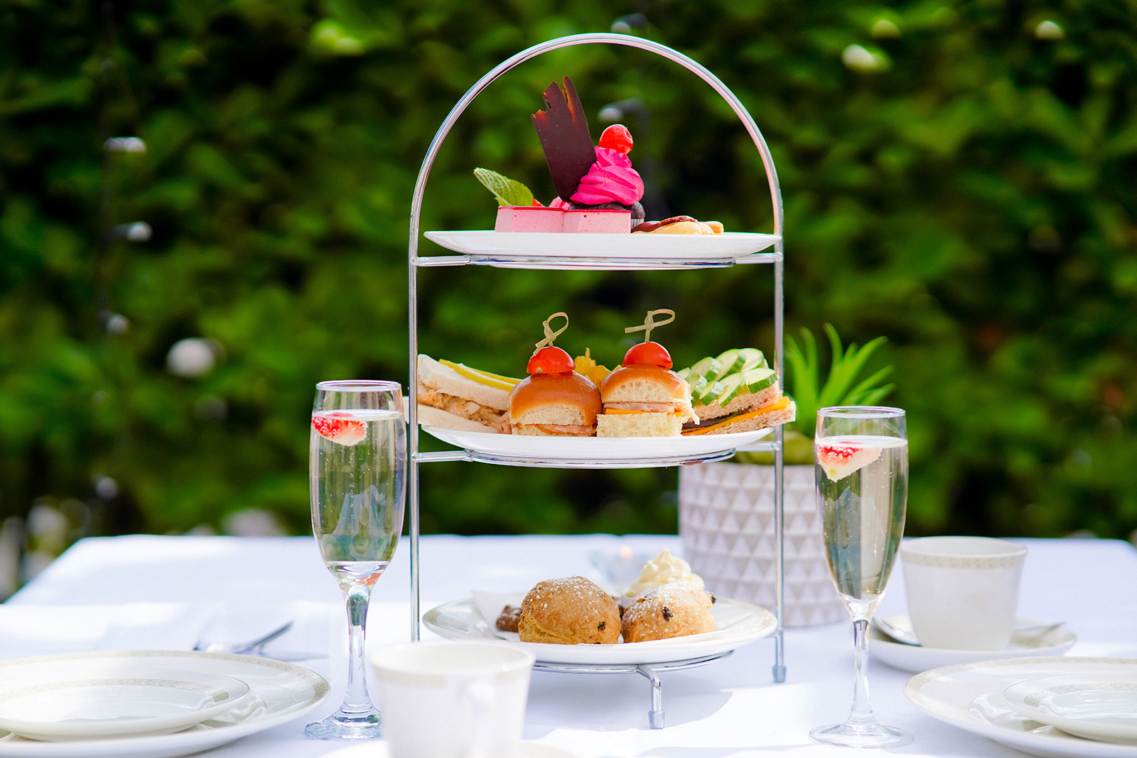 Enjoy a selection of delicate home baked treats with Savoury & Sweet Treats and Home Baked Scones with Cream & Jam. Menu changes seasonally.