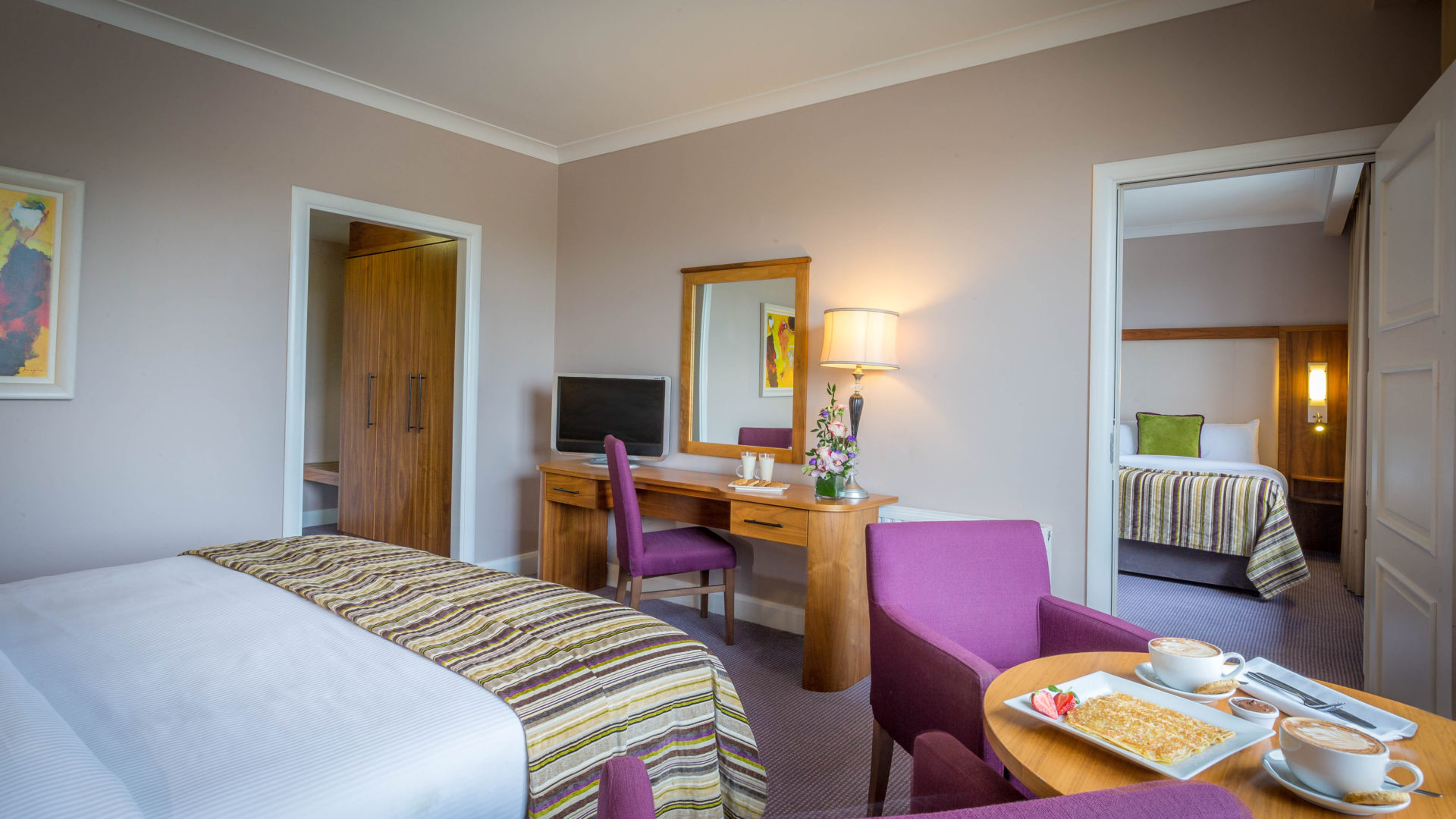 These interconnecting rooms are perfect for the family with older children. These rooms have high-speed wifi, workstation, power shower, heated mirror in the bathroom, 28inch TV. Included in each room are complimentary bottled water, tea & coffee making facilities, & telephone.